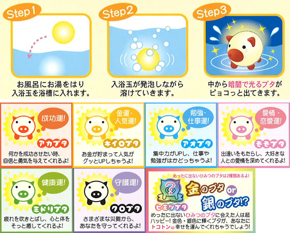 | ◇『幸せを運ぶハコブタ』のマスコット入り入浴玉。 |