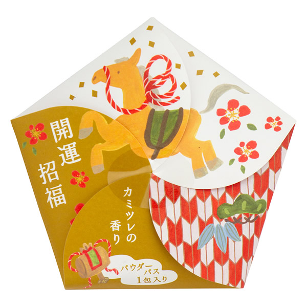 | 縁起の良い五角形のパッケージに干支をデザインした入浴料。 内側には、馬にまつわる豆知識が書かれています。 カミツレの香り 若葉色の湯 保湿成分 カミツレ花エキス、ヒアルロン酸Na、セラミド 配合 |