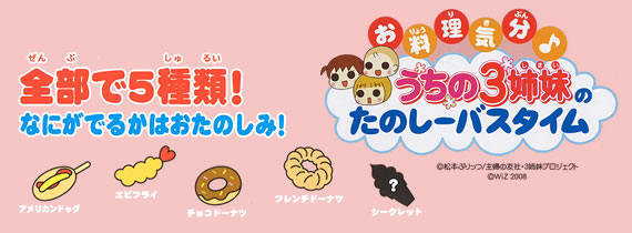 | たのしーバスタイムシリーズにうちの3姉妹バージョンが登場! 入浴剤がシュワシュワ溶けてまるで本物のあげものをあげてるみたいになるよ! 何がでるかはお楽しみ! ※エビフライ・アメリカンドッグ・フレンチドーナツ・チョコドーナツ・シークレットの 5種類のうちひとつが入っています。 |