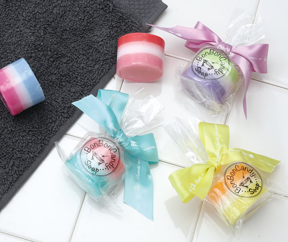 カラフルだけど、大人っぽいデザインの、キャンディのようなミニソープ。